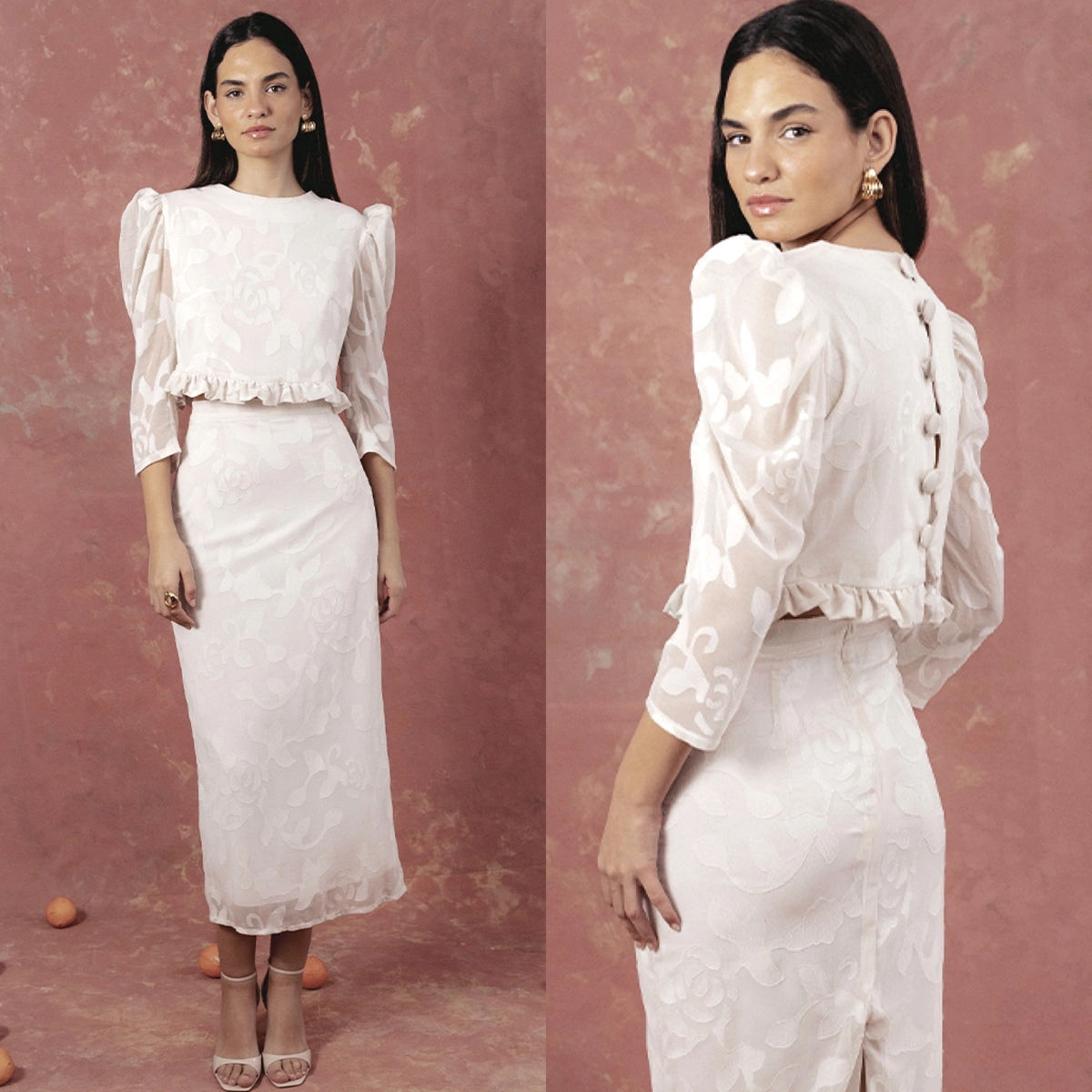 Conjunto compuesto por top con mangas tres cuartos abullonadas, minivolante ...