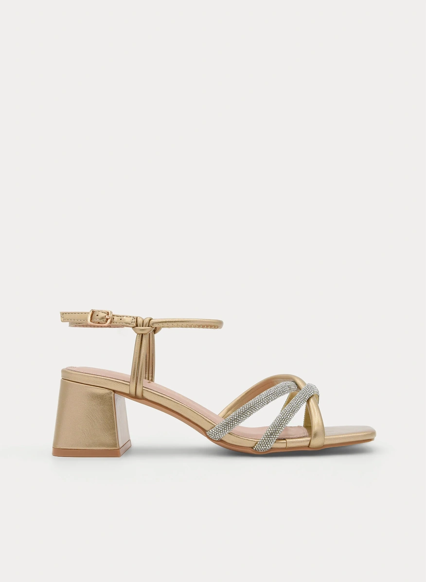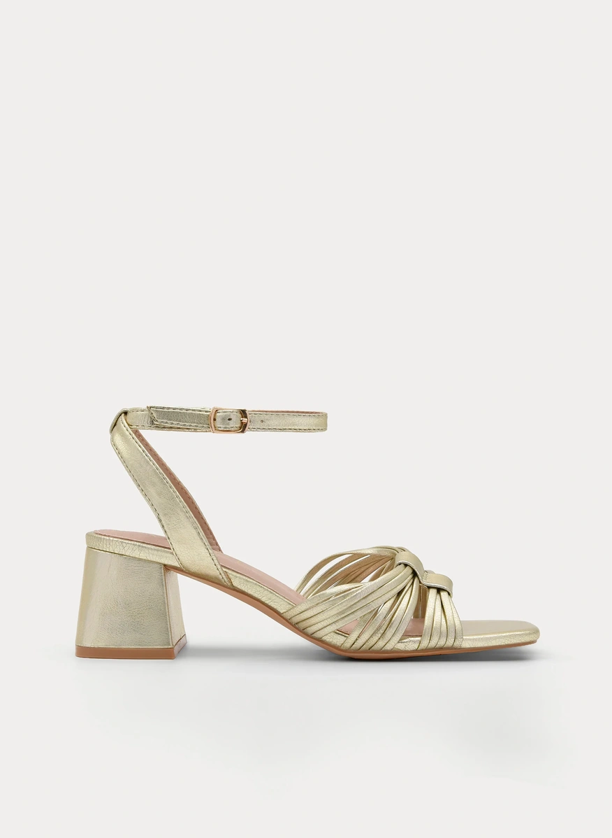 Sandalia dorada con pala cruzada fruncida en el empeine, tacón ...